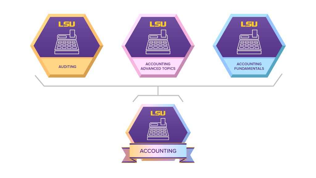 Digital badges, given at the completion of an online learning program, designed with shape to denote area of study, icon to mark category of program within the area of study, and color to distinguish individual badges in each category.