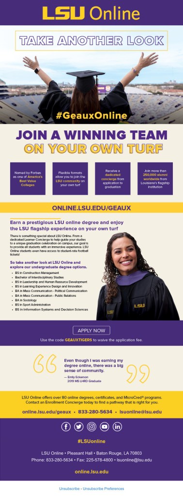 LSU Online & Continuing Education brings alternative accessible educational opportunities to the Louisiana community and beyond. Through Pre-College programs, LSU Online degrees, Professional Development programs, and the Osher Lifelong Learning Institute, LSU OCE has something for everyone.