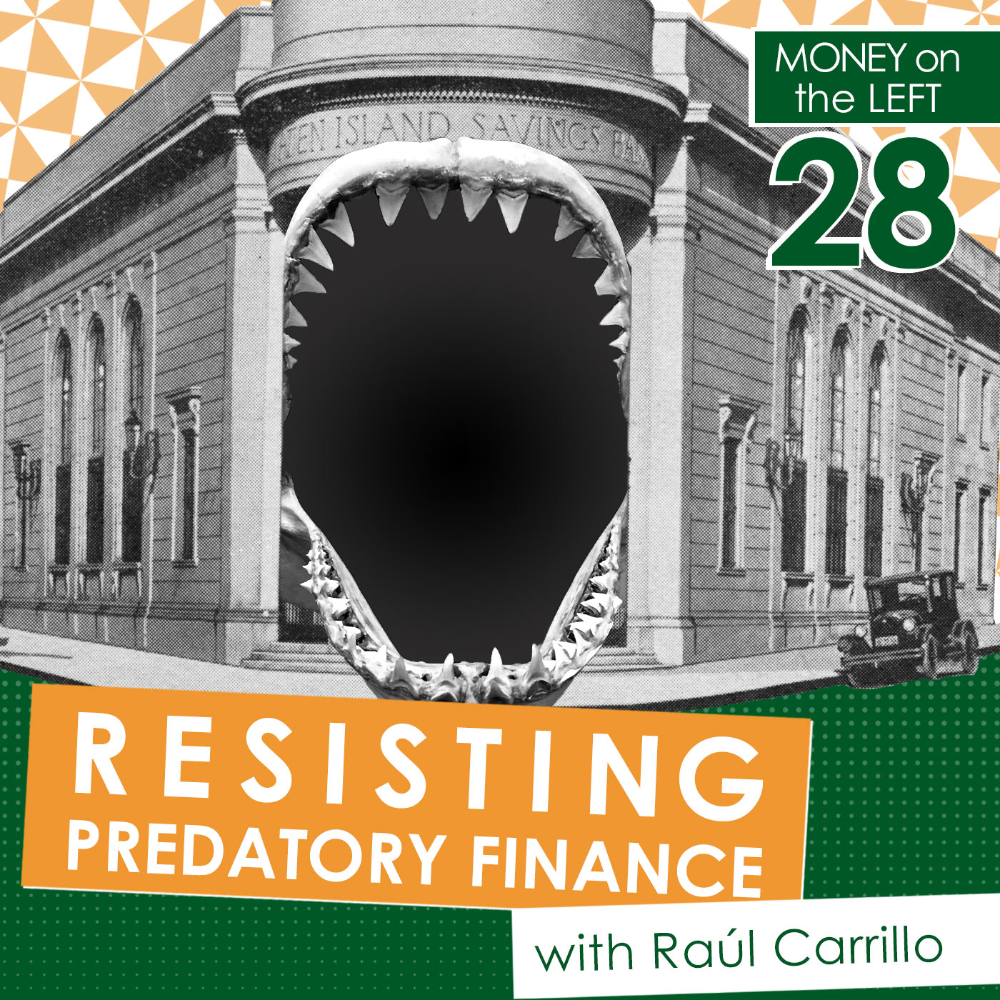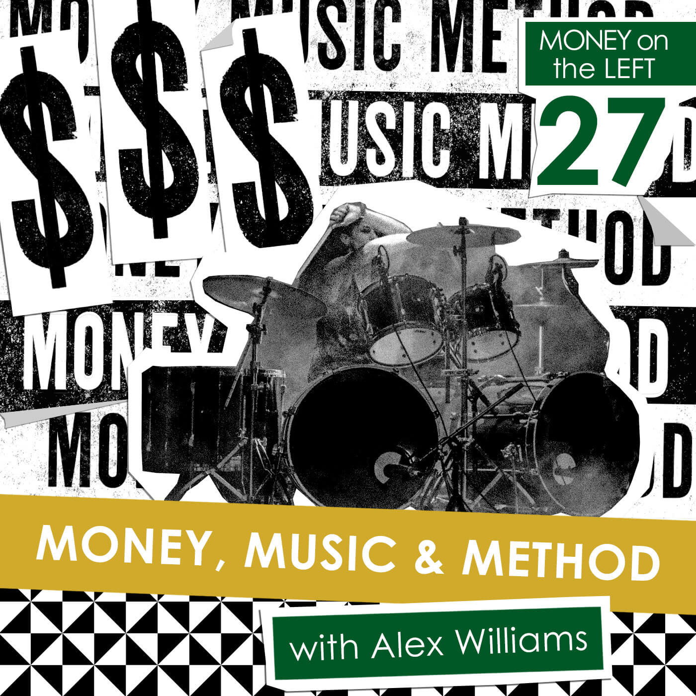 Visuals for Money on the Left incorporate old or aged photographs and a collage style to incorporate the signature geometric pattern from the MotL branding. I expanded their single color branding to a 6-color palette for promotional materials, to allow for a fresh look each month.