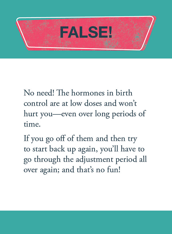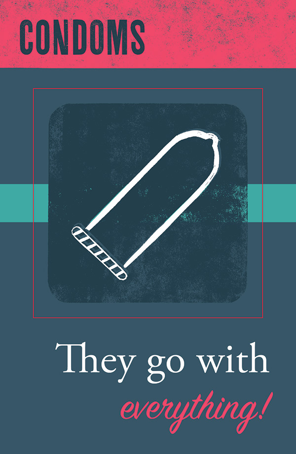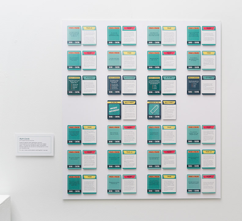A deck of playing cards featuring information on birth control options and myths surrounding their use. Set of 28 double-sided cards (standard playing card dimensions). Digitally printed.