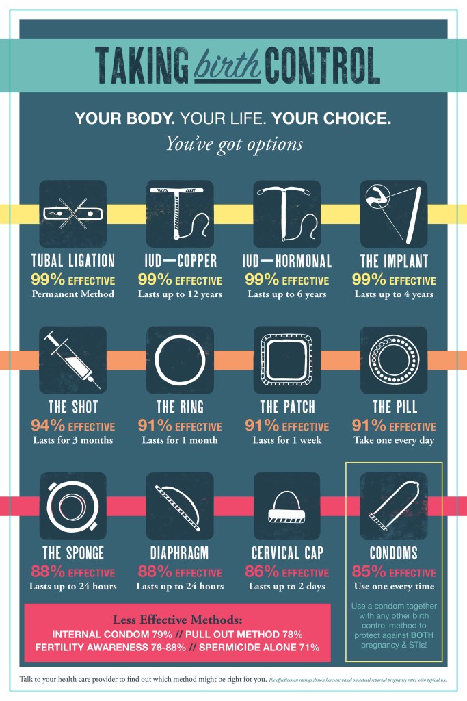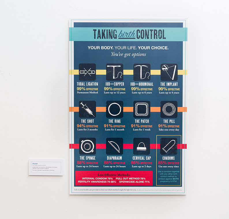 A poster featuring effectiveness rates of birth control options. 24″x36″ digitally printed. Featuring letterpress-printed icon design.