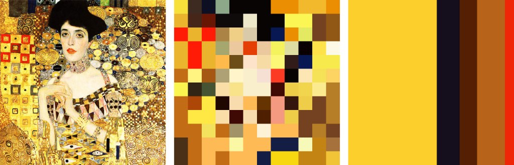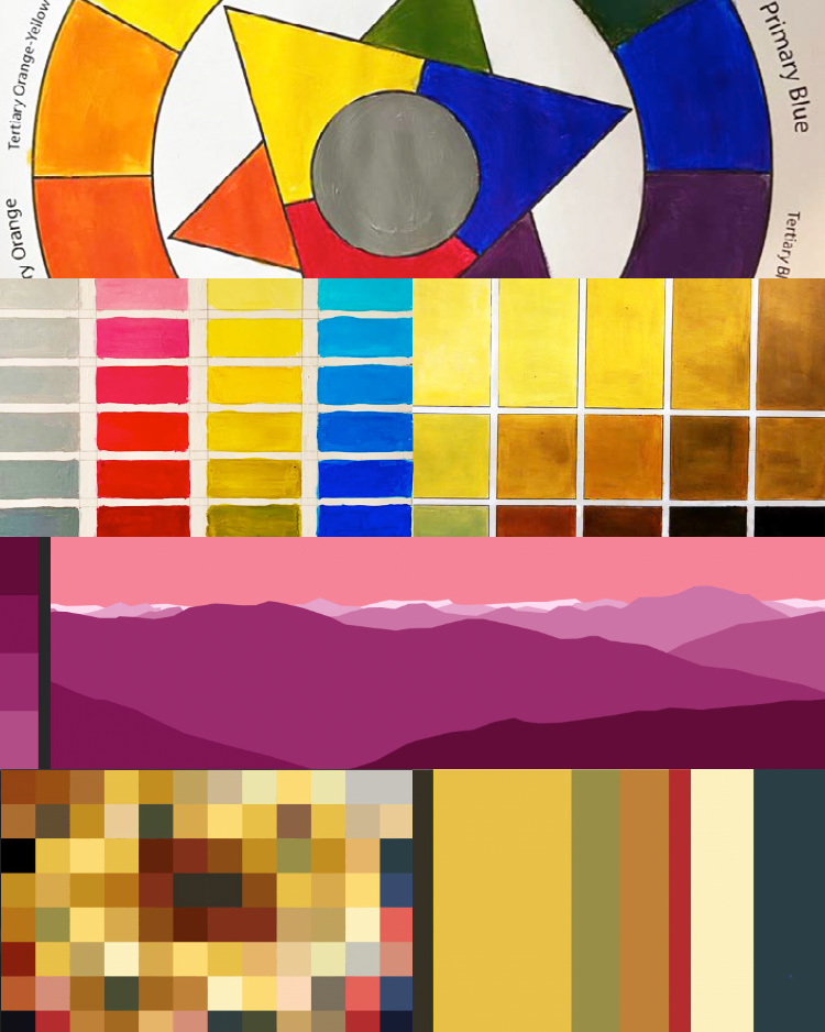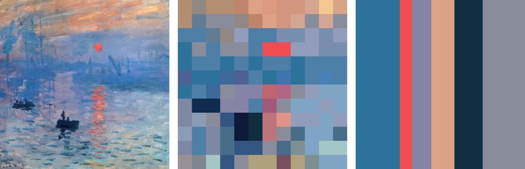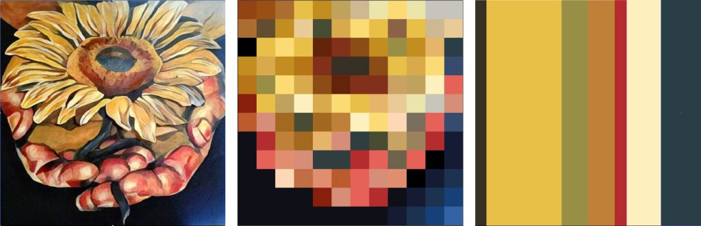 Students select an image to study and submit the title and artist/source. They manually simplify the image down to a 12×12 square ‘pixelated’ image. Then they simplify again to a 6-color proportional palette. We discuss an artist’s process of selecting, expanding, honing, and applying a color palette; this study approximates a reverse of the artist’s process.