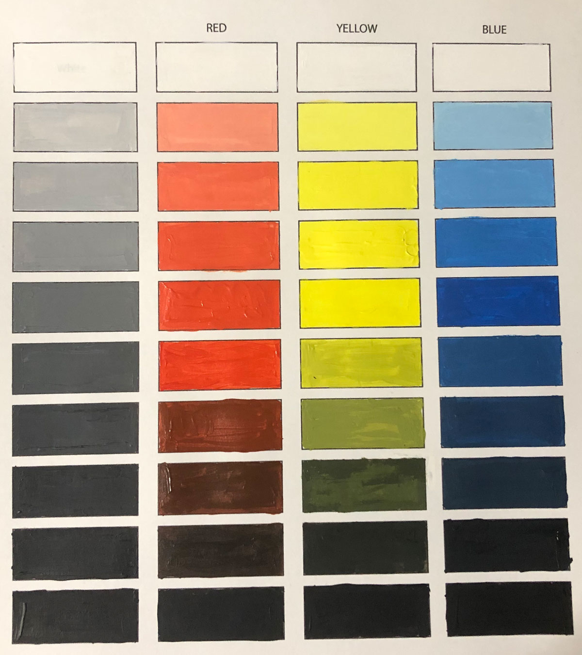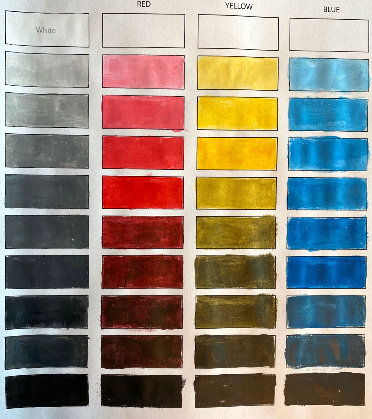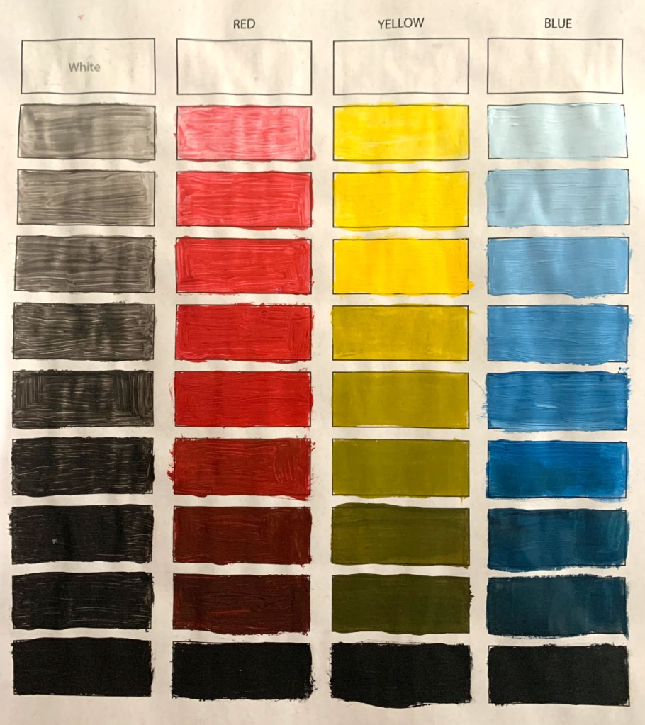 A traditional RYB + gray value study made with acrylic paints to help students recognize the inherent value of colors and practice mixing tints and shades.