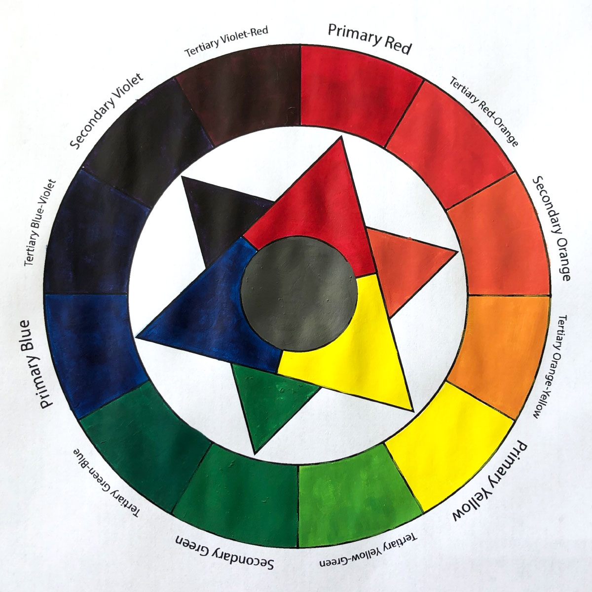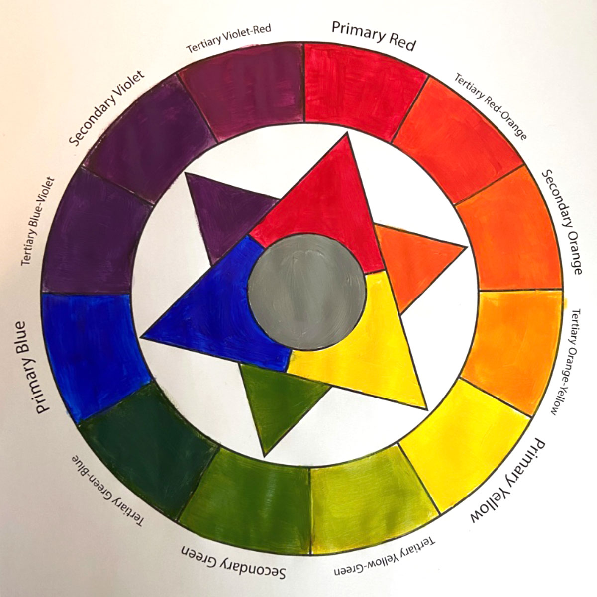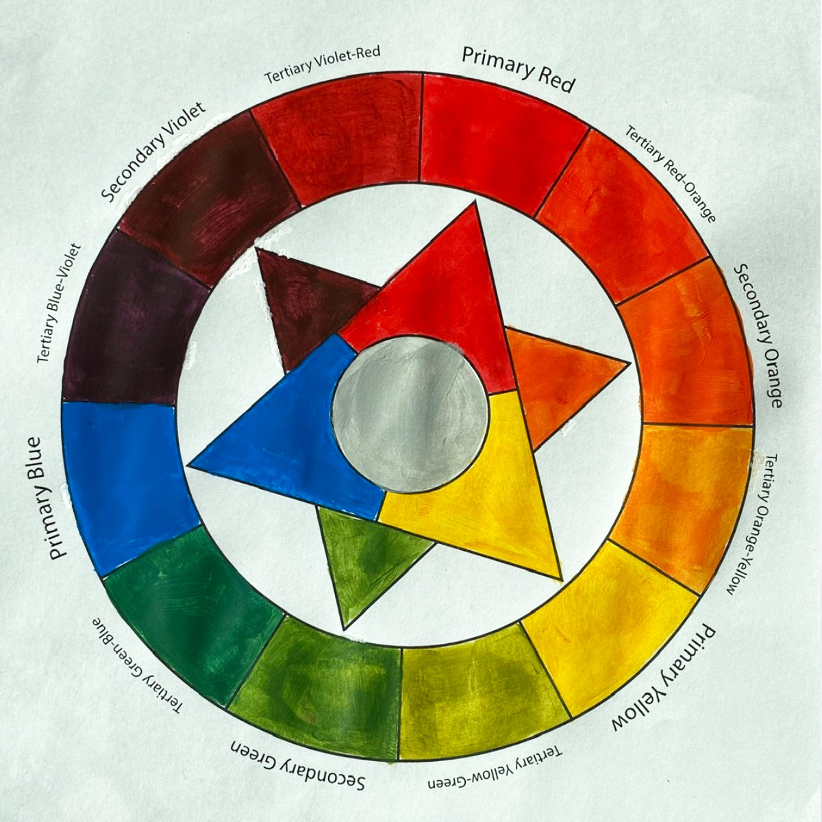 A traditional RYB color wheel made with acrylic paints to reacquaint students with the basics of color relationships.