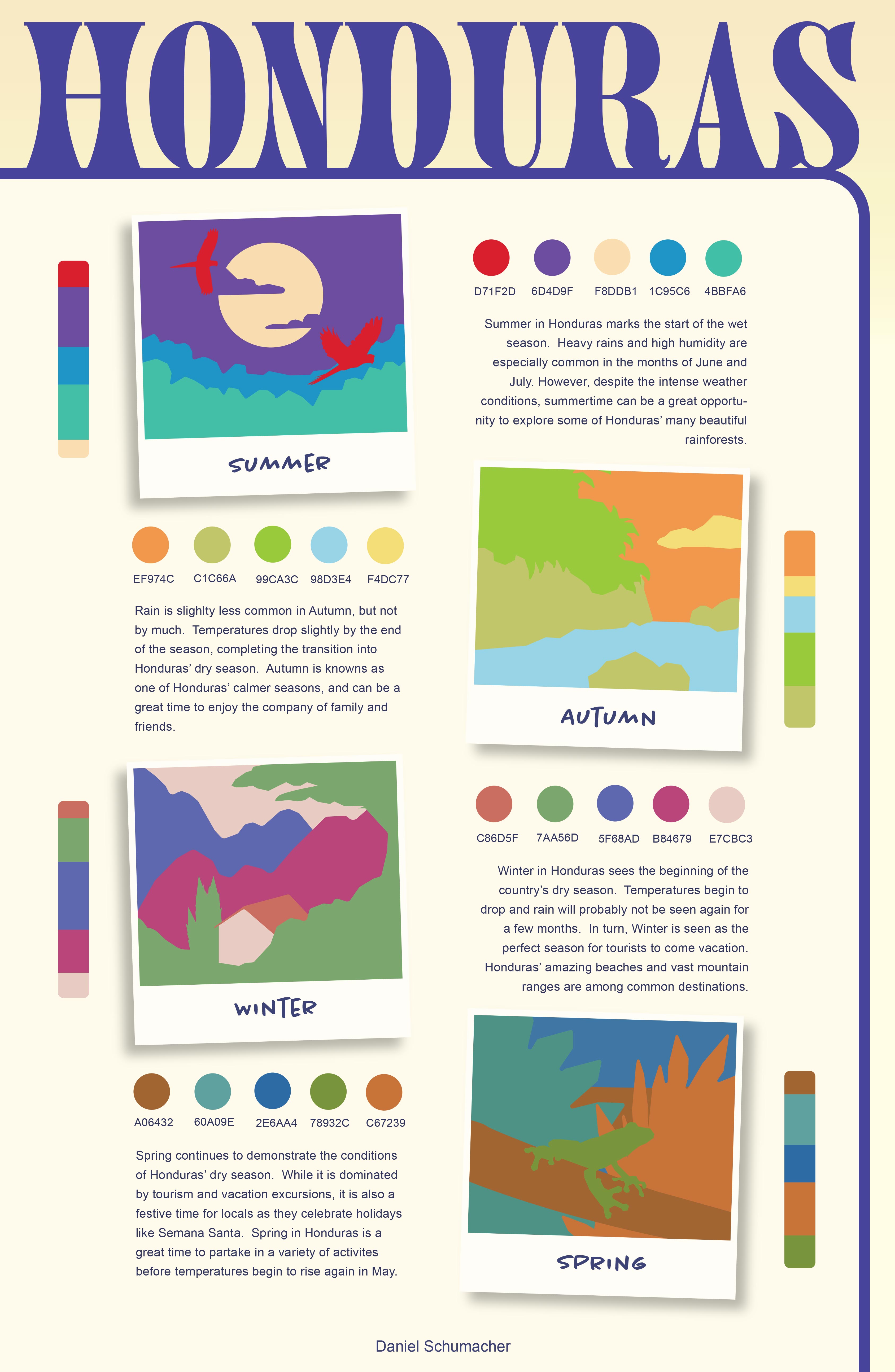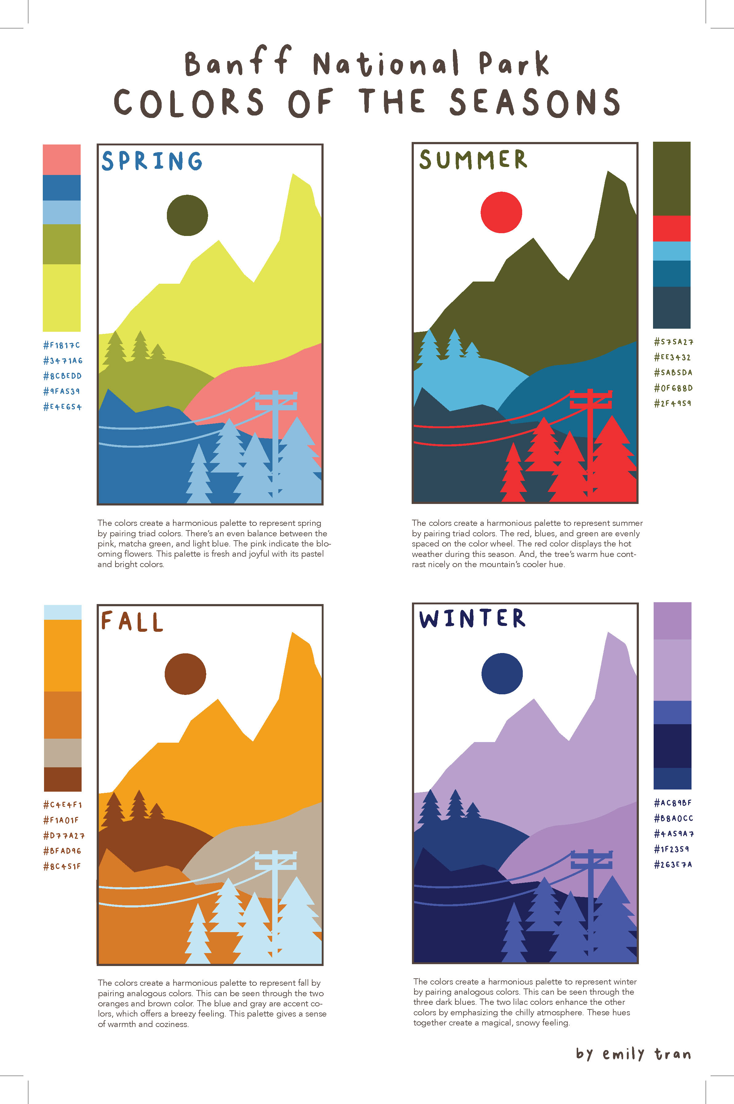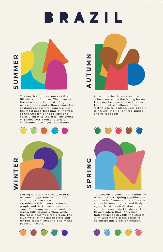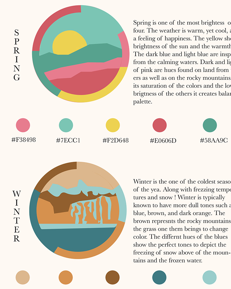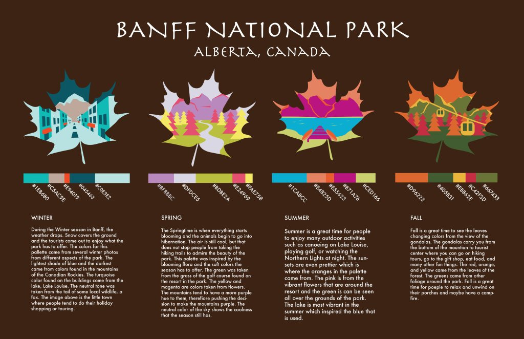 In this project, students choose a location and explore the way colors there change through the seasons. They research their location and build a mood board for each season, then build a 5-color proportional palette to represent that location for each of the 4 seasons. The final presentation is an 11×17 inch poster clearly presenting all 4 palettes including the HEX codes for each color, and a short description of how the colors represent the location’s seasonal changes. Each palette must make use of tint, shade, and saturation to achieve visual harmony.
