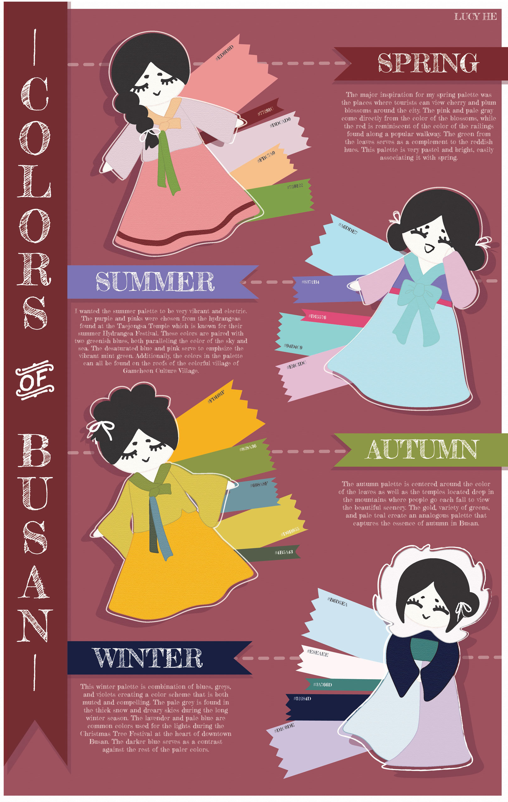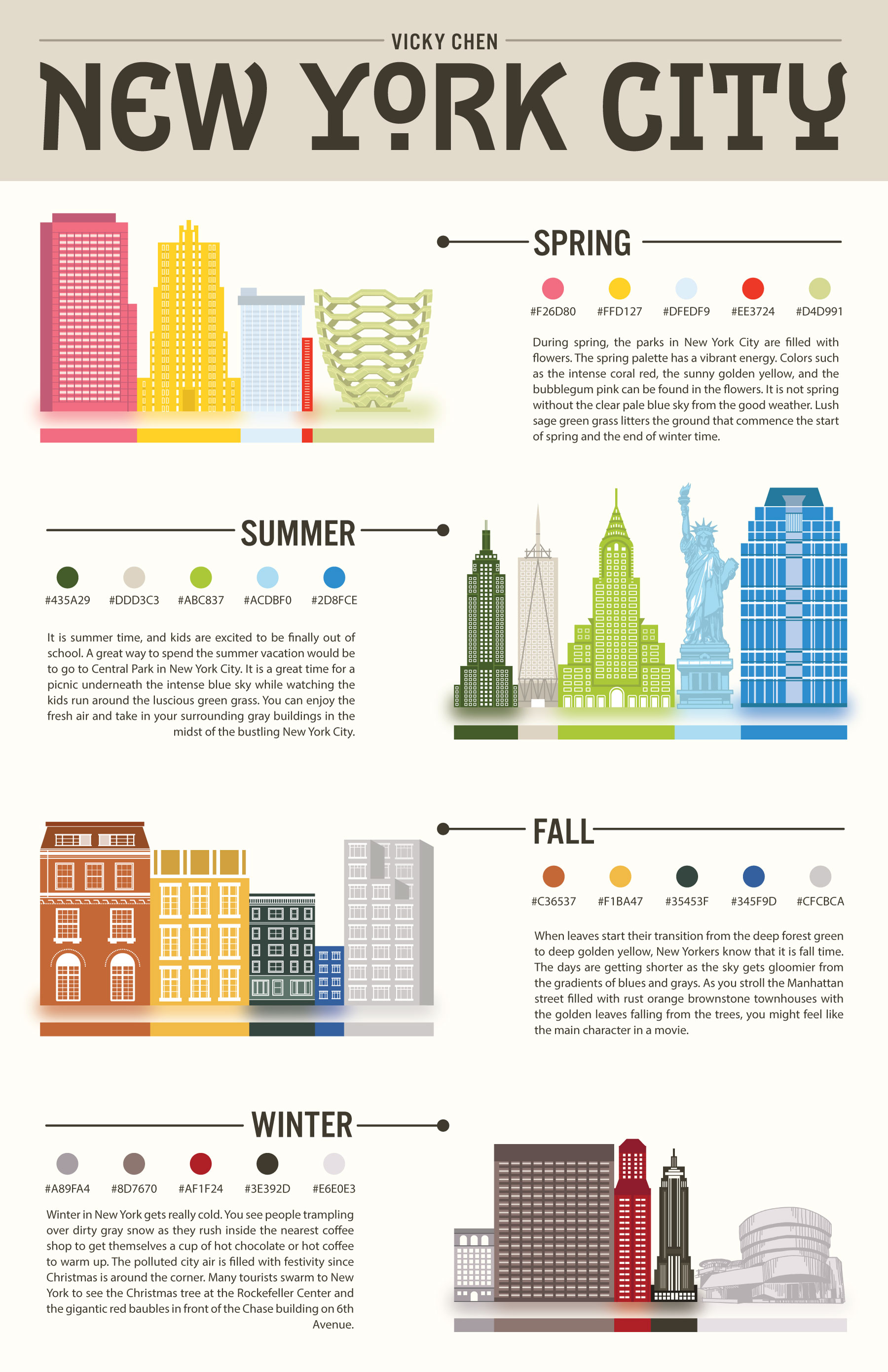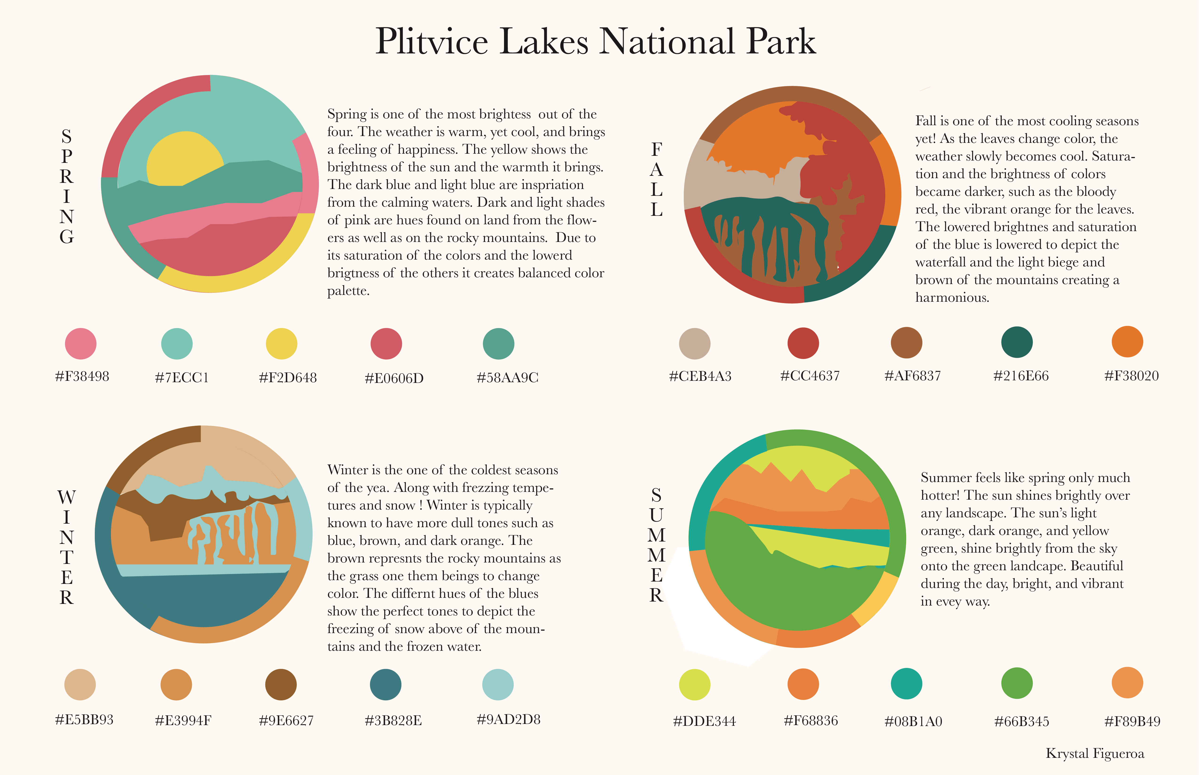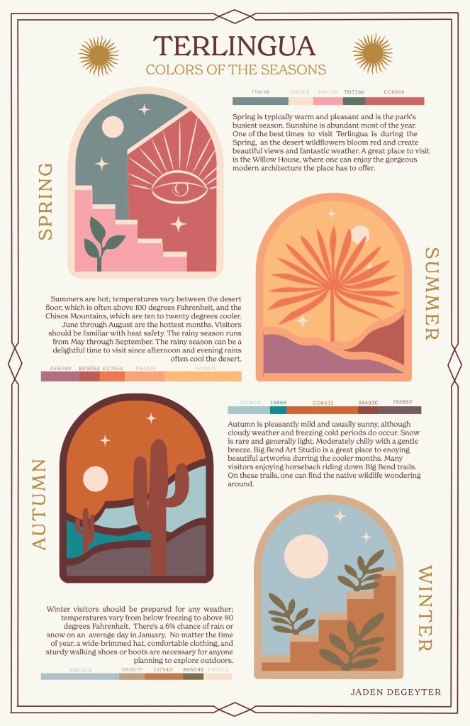 In this project, students choose a location and explore the way colors there change through the seasons. They research their location and build a mood board for each season, then build a 5-color proportional palette to represent that location for each of the 4 seasons. The final presentation is an 11×17 inch poster clearly presenting all 4 palettes including the HEX codes for each color, and a short description of how the colors represent the location’s seasonal changes. Each palette must make use of tint, shade, and saturation to achieve visual harmony.