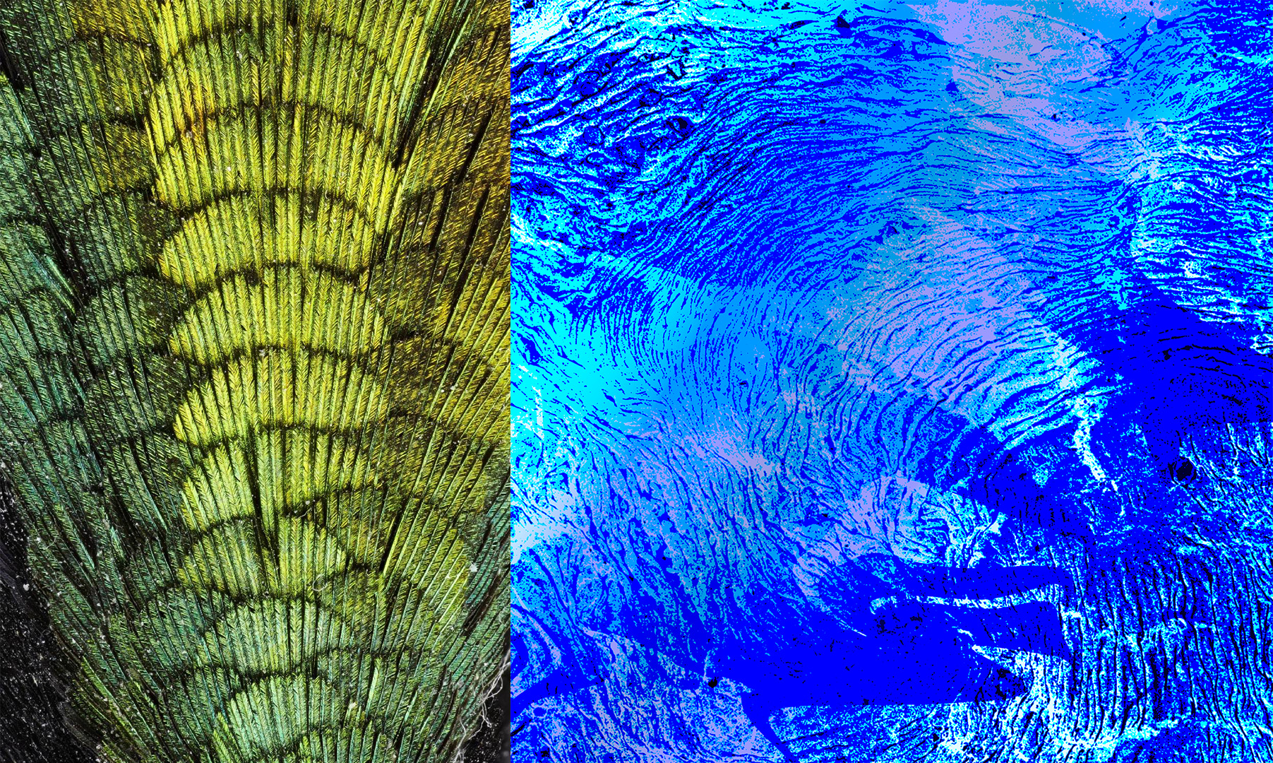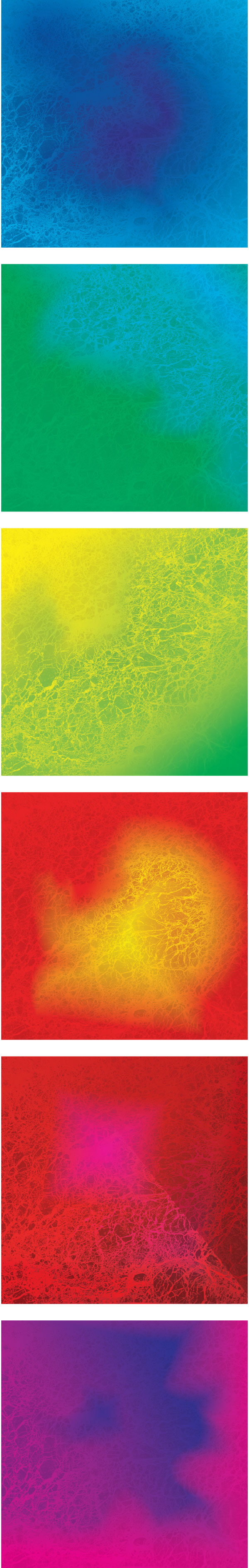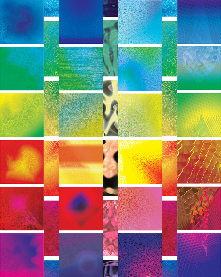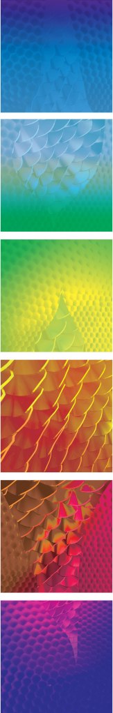 This project was designed in collaboration with LSU Entomology Assistant Professor Dr. Nathan Lord. Students work with analogous color palettes and experiment with saturation and value. First, students learn about the science of iridescent coloration, next they look at examples of artistic exploration of iridescent phenomena, and finally they use Photoshop to combine texture, gradients, and blending modes to create visually dynamic color compositions. Each student produces a set of six cohesive images, each image spanning an analogous palette that together encompass the entire visible spectrum.