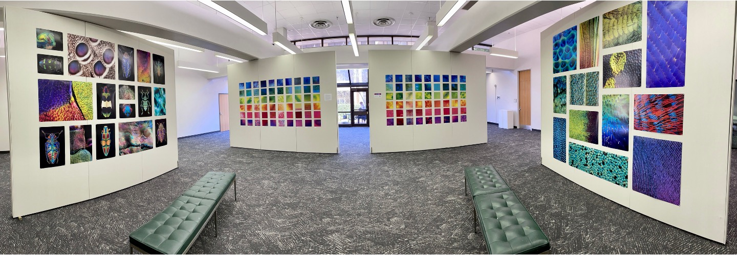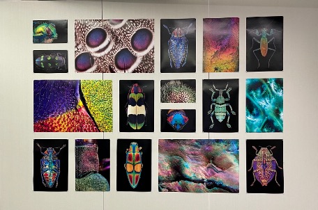 The final products for the first semester’s students (Fall 2021) were included in a year-long exhibition at the Louisiana Art & Science Museum’s Iridescence exhibit alongside work by world-renowned artists, scientists, and scholars. The second semester’s student work (Spring 2022) was featured in a month-long exhibition in LSU’s Boyce Gallery, along with photographs from the LSU Entomology Department’s research on iridescent insects.