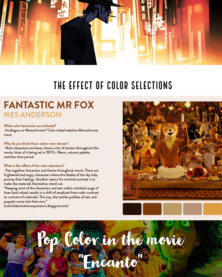 In this assignment, students select an example from pop culture (album art, music video, film, video game, etc.) to analyze. They demonstrate understanding of color harmonies, color psychology, and color as a tool rather than just decoration as they explain the colors used, their intended effect, and their practical outcomes. Students may choose to present their findings in person using whatever visual means they like and engaging the class in discussion, practicing their oral communication skills; or they may choose to use Adobe Express to create a webpage showcasing their findings and practicing their written communication skills. Samples below are from students who chose to use Adobe Express.